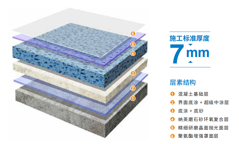 工艺特点:厚度6-10mm,标准8mm;铺装工艺施工,后期需作研磨和抛光处理;工艺较复杂,施工周期7-10日